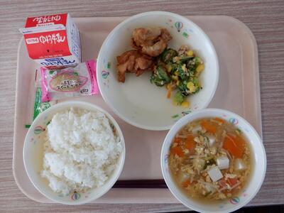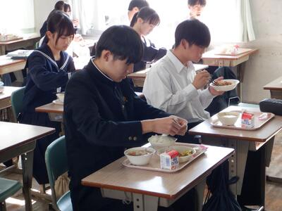 下の写真は、今回のメニューをリクエストした3年1組の給食の様子です。