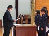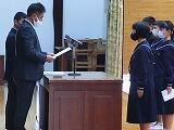 新生徒会執行部の任命式、各全校専門委員会委員長・副委員長の任命式、新生徒会長の挨拶、旧生徒会役員からの言葉、感謝状授与、校長先生からのお話がありました。