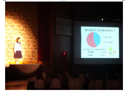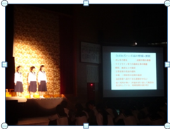 写真のようにスクリーンを使い、分かりやすく発表することに心がけ、原稿なしで説明できるように何度も何度も練習しました。当日は緊張しましたが、自信をもって堂々と発表することができました。