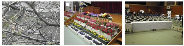 桜のつぼみもようやく柔らかくなり、1・2輪咲いている気候(下写真左)での雨でしたが、体育館の中は、栽培委員が丹精込めて育てた花が彩りを添えていました。(下写真中)
