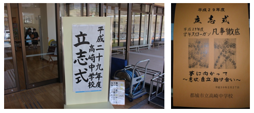 前日の準備では、在校生の皆さんが会場設営をしました。厳粛な式にふさわしい立派な会場ができあがりました。(下写真右)