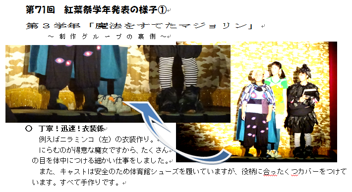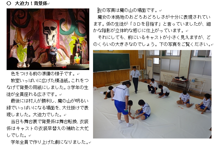 全員で作り上げた劇で学年の絆が深まりました。また、それぞれ演技や制作を通して、豊かな表現力への興味が高まったのではないでしょうか。感動的な劇でした。