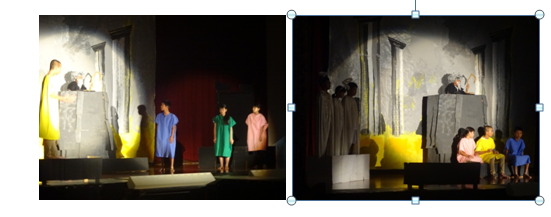 上右の写真をご覧ください。背景の細かい描写が見えますでしょうか。この劇の設定を忠実に表現しようと、背景の生徒たちが丁寧に粘り強く仕上げました。あまりの精巧さに感嘆の声が起きたほどです。
