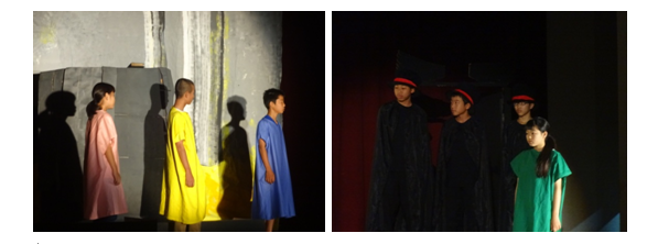 上右の写真をご覧ください。背景の細かい描写が見えますでしょうか。この劇の設定を忠実に表現しようと、背景の生徒たちが丁寧に粘り強く仕上げました。あまりの精巧さに感嘆の声が起きたほどです。