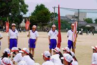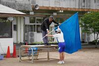 1年生から3年生までのリーダーと副団長・団長による障がい物競走の速かった順に、赤青の紙吹雪が入った風船を選び、団色が決まりました。