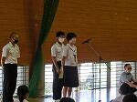 今年度の生徒総会は、新型コロナ感染症対策としてできるだけ密にならないように、前半と後半に分け、前半では、全校放送を使ったり、各学年に生徒会執行部が付き、トランシーバーで連絡を取り合ったりして、生徒会の決算報告や、各種委員会の活動報告、質問や要望についての回答をしました。いつもの生徒総会とは違うやり方でしたが、一生懸命にしていました。