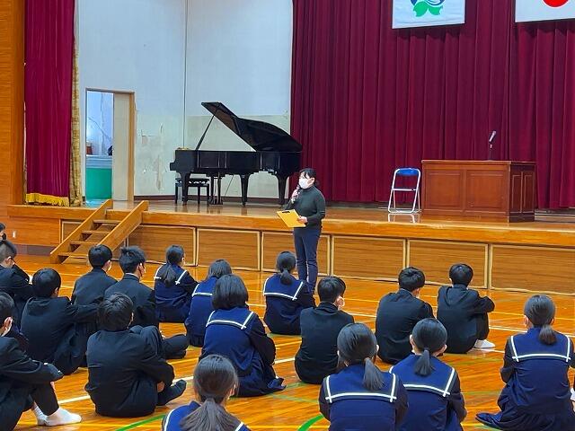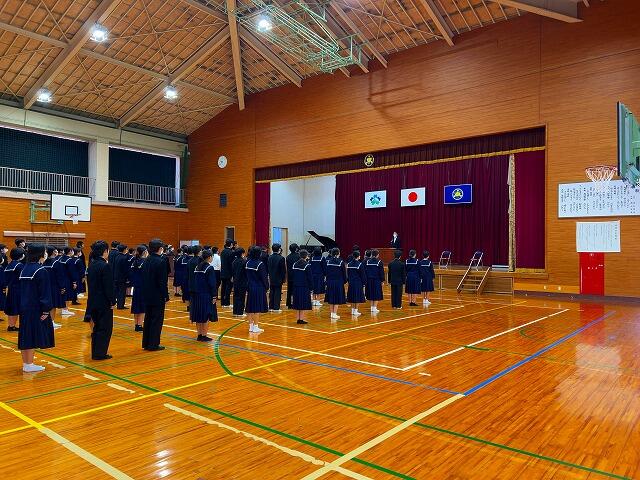 令和5年度修了式を行いました。各学年と生徒会の代表が1名ずつ、今年度の振り返りと次年度の目標を発表しました。その後、校長先生が1年間を振り返っての話をしました。式の後に、学習面、保健面、生徒指導面での確認が担当の先生方からありました。