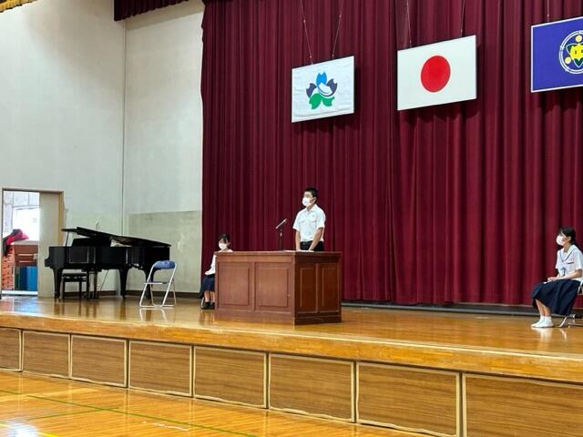 6月21日(水)、全校集会を行いました。全校集会では、生徒会役員が中心となり委員会からの連絡や学校全体で取り組むことを発表します。