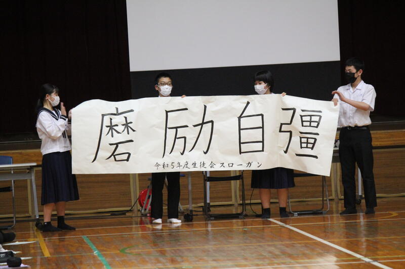 最後には、今年度の生徒会スローガン「磨励自彊(まれいじきょう)」を発表しました。生徒全員で協力して、よりよい高崎中学校にしましょう。