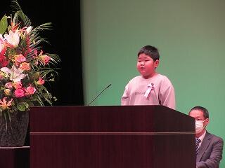 作文の表彰の後、代表の児童・生徒が発表が発表しました。テーマは、「郷土」「家族」「心が動いたこと」「学校」について書いた作文でした。会場でも涙を流す方たちもいらっしゃる感動的な時間でした。 3年生代表作文発表「ぼくのお母さん」