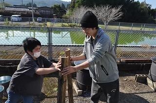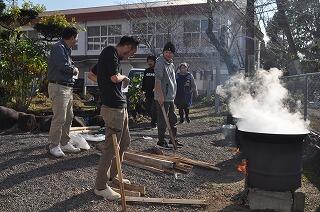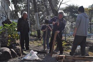 外ではそばつゆ作りの準備で、まずは薪を用意しています。
