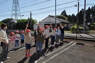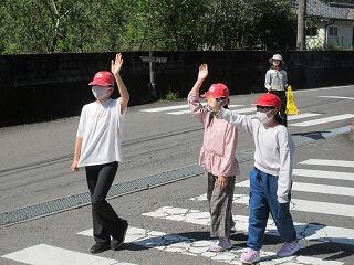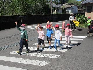 交通安全教室を実施しました。小学部は、校内で練習をしてから実際に横断歩道を渡りました。しっかりと手を挙げて確認して渡ることができていました。