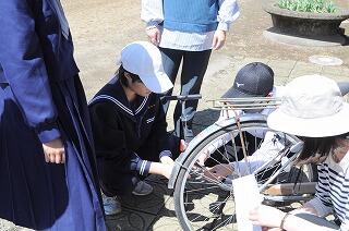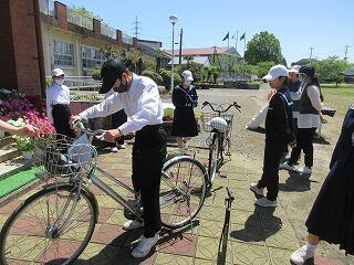 中学部は、実際に自転車の点検をしました。適切なサドルに位置なども確認しました。