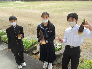 7年生(中学1年生)がタケノコを掘って、校長室に見せに来てくれました。理科の植物観察の時間に、タケノコを見つけて掘ったそうです。なかなか大きなタケノコでした。