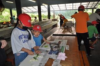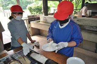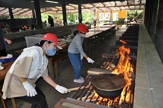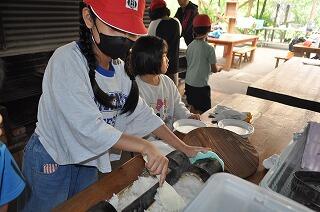 まずは、班に分かれてかっぽ飯と豚汁をを作りました。火をつけて、材料を切るところから味付けまで、すべてを子どもたちが協力して作りました。