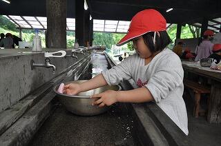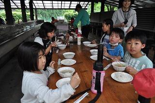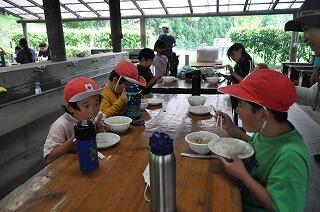途中、キャンプファイアのような火加減もあって心配されましたが、出来上がりは豚汁もかっぽ飯もどの班のものもおいしかったようです。炊き立てご飯は、特においしかったです。