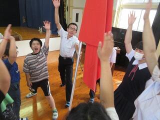 今も子どもたちが歌う第2校歌「君よきらめく風になれ」や「笛水きらっと音頭」の作詞者、山元俊朗先生が来てくださいました。