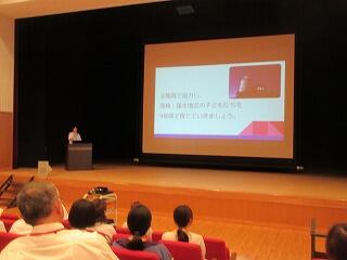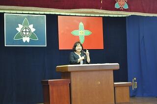 最初に、都城市教育委員会教育部長の黒木有美子様の講演がありました。演題は「教育の力で未来をつくる~教育委員会の事業をとおしてみた地域・高崎町」で、教育委員会はどのようなことを行っているのか、高崎の今の現状など、多岐にわたる内容で、学校、地域とともに、子どもたちをはぐくみ未来をつくっていくというお話でした。