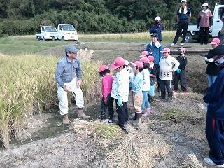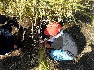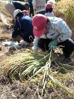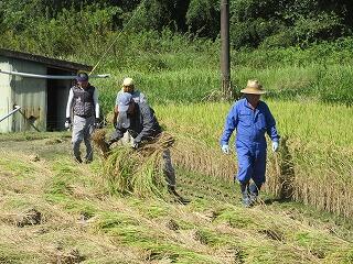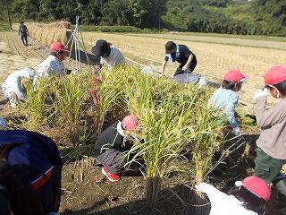 10月14日(月)に稲刈り体験を行いました。まず、前日に笛水地域活性化委員会の皆さんが準備をしてくださり、当日、子どもたちの体験ができました。