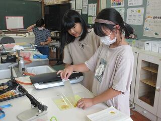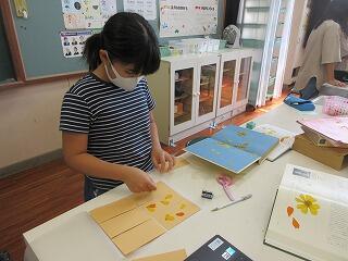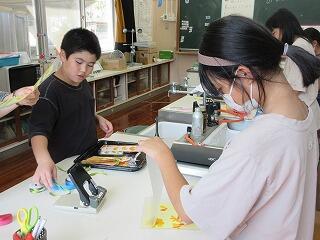 椎屋様からいただいたコスモスの花を、5、6年生が押し花にして、しおりを作りました。そのしおりを、秋祭りで配布します。