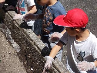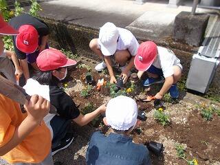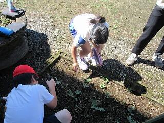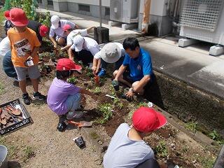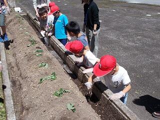 5月16日(木)、みどりの少年団の活動として、さつまいもの苗を植えました。日差しが強い中での作業でしたが、全員で1本1本丁寧に苗を植え、たっぷりと水をまきました。