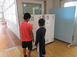 6年生が1年生にタブレット保管庫の説明をしています。
