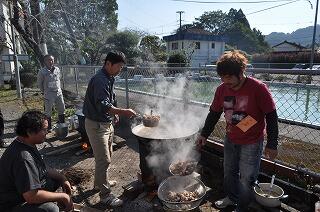 外では、出汁をとってからのそばつゆ作りと、打ったそばを湯がいてもらいました。薪や出汁に使う大量の鶏肉、おにぎり用のお米、そばに入れる柚子なども、地域の方にいただきました。ありがとうございました。