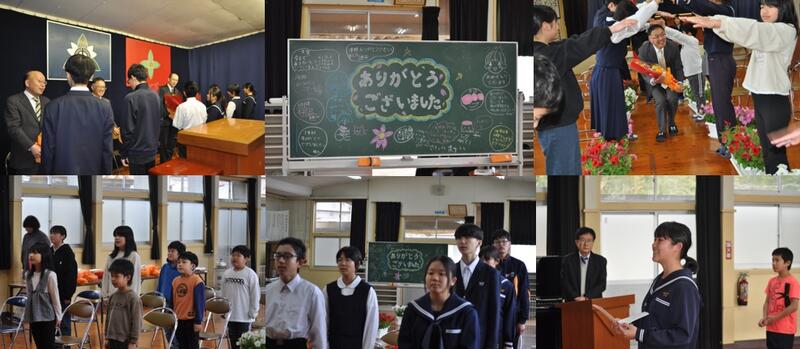 離任される先生方の紹介の後、お一人ずつからあいさつをいただきました。笛水小中学校での思い出や在校生や卒業生へ向けてのメッセージを語っていただきましたが、心に残るものとなりました。全校児童生徒から小黒板に離任される先生方にメッセージを書き、最後はアーチを作って見送りました。