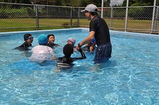 暑さ対策として、こまめに休憩を入れて給水をし、脚を冷水で、全身はミストを浴びて冷やしました。練習中も、ネッククーラーで首を冷やしている子どももいました。