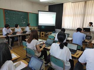 放課後に行った先生たちによる授業研究会でも、PCを利用して全員の意見を共有しながら行いました。これから11月までに、先生たち全員が研究授業を行い学び合っていきます。