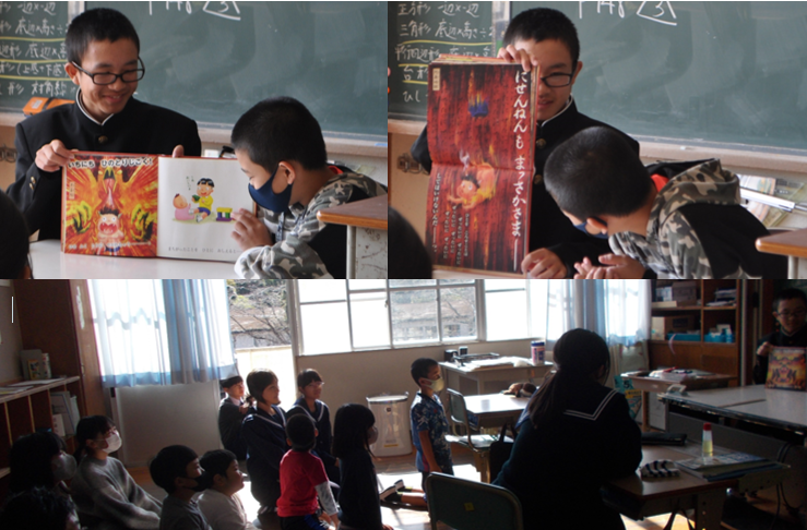 今日は、7年生の生徒と5年生の児童が読み聞かせを行いました。「一日〇〇」シリーズの中の「いちにちじごく」