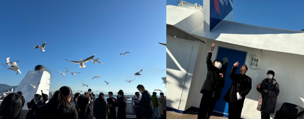 熊本港から島原港へ。カモメに餌やりをしています。(かっぱえびせん)ときどき自分も一口いただきながら…。