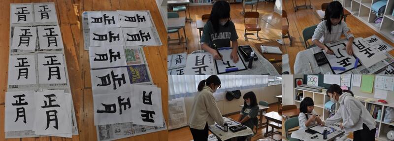 活動は国語の授業で、2時間かかりました。1時間目は、筆の使い方や筆順などについて確認をし、2時間目で実際に筆や墨汁を使って「正月」と書いていきました。普段学習に使っている鉛筆とは違い、慣れていないので全体的なバランス、文字の太さなど苦労することが多かったようです。何度も書いて練習し、最終的に納得のいく作品ができ、学校名、学年、名前を小筆で書き入れ完成しました。