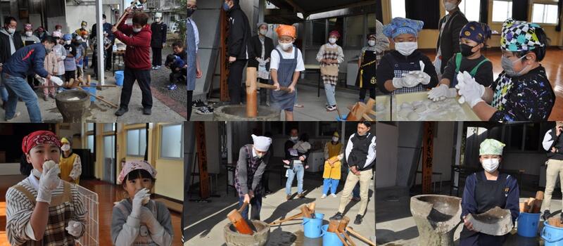 6月にもち米の苗を植え、10月には稲刈り、11月には脱穀があり、この日は米作りに関する学習のまとめとなりました。児童生徒はそれぞれの体力に応じた重さの杵を使って餅をつき、ついた餅を丸めました。全児童生徒が楽しく餅つきができたようです。勢い余って臼を割ってしまう事件も起こりましたが、これはパワーがありすぎたのではなく、老朽化していたのが原因のようです。