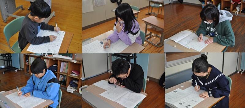 当たり前ですが、どの児童生徒も真剣な面持ちでテストに取り組んでいました。手ごたえは、「やさしかった。」、「難しくて半分ぐらいしかできなかった。」など様々でした。結果が出るまでに約1カ月かかると思いますが、小学生や7年生はこの結果を受けて、来年度の個人カルテをアップデートし、授業改善に努めていきます。
