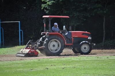 8月20日(日)に、PTA奉仕作業で運動場の草刈りや除草剤散布はしていましたが、トラックやフィールド部分の草野丈は長く、だいぶ枯れてきてはいるものの、運動会の練習や競技をするには妨げになります。そこで、竹元様がトラクター型の機会を持ち込み、枯れ始めた草の除草をしてくださいました。おかげさまで、運動場は見違えるようになり、児童生徒も気持ちよく練習に取り組むことができます。