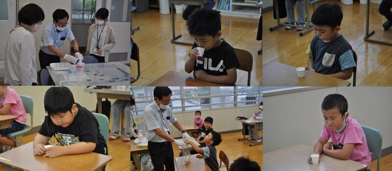 2校時と3校時の間にある業間を使っての実施でした。3名の1年生にとっては、初めてのことでしたが、先生方の指導で、スムーズに終えることができました。気になる反応を見てみると、「水みたいで味がしない。」、「苦い。」、「辛い」など受け取り方は様々でした。