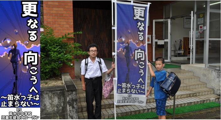 今年度の児童生徒会のスローガンは、「更なる向こうへ~笛水っ子は止まらない~」です。毎年、生徒会予算から費用を捻出し、スローガンを記したのぼり旗を玄関や道路に面した体育館駐車場に掲げています。注文していたのぼり旗が届き、6月29日から掲示することになりました。