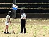縄文・弥生時代歴史と石器や土器などについての学習では、文化財課の方の説明を聞いたり、感染症対策に注意しながら実際に土器や石器などに触れたりしながら、子どもたちは縄文・弥生時代の人々の生活について、理解を深めていたようでした。児童が一番盛り上がったのは、弓矢体験と火起こし体験でした。縄文時代の服装になり、縄文人になったつもりでイノシシの絵を的に見立てて矢を放ち、「当たった。」、「外れた。」と歓声が上がり、楽しそうでした。火起こし体験では、2人がペアとなって声を掛け合いながら活動しました。なかなか火が付かず、苦戦しましたが、ほとんどの児童が火を起こすことができ、達成感も味わったようです。一番むきになって取り組んだのは、永野先生と森先生のペアでした。子どもの手前、一番真っ先に火を起こさないと恥ずかしいとプレッシャーもあったようです。