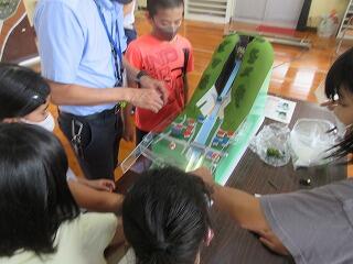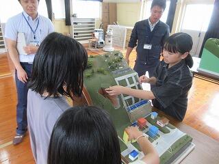 次に、模型を使って、自分たちで地すべりや土石流を起こしてみました。また、土石流防止のためにコンクリートの壁を入れると土石流が下まで流れない様子も模型で学習しました。