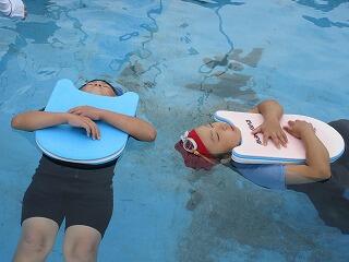 最初に水の中での息の吐き方の練習をしました。次に、水に浮く方法を教えていただき、今まで水が耳に入るのを怖がっていた児童も、耳まで水につけてラッコスタイルでプカプカと浮くことができました。