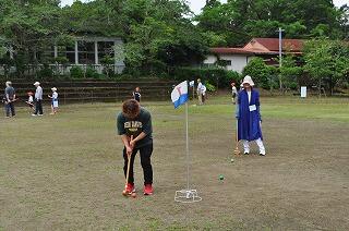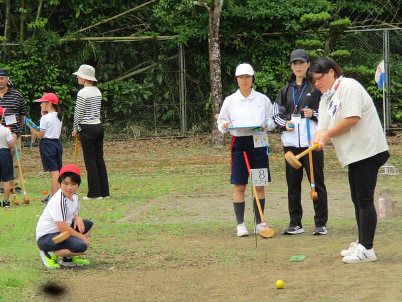5月24日(金)に地域の人々とのふれあい会を行いました。子どもや保護者、地域の方を含め、57名でグラウンドゴルフを行いました。