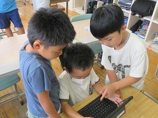 小学部1年生のタブレットが揃ったので、さっそく2時間目の休み時間にPC教室が開かれました。
