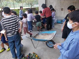 天気が少し悪かったので、渡り廊下を利用したのですが、体験の時間になると雨もやみ、外も使ってできました。