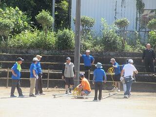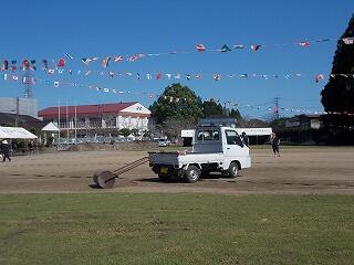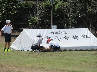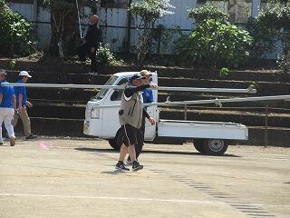 運動会の前日準備から片付けまで、地域の方、保護者の方、総出で行いました。テント設営はもちろんのこと、入場門、団看板、万国旗にグランド整備まで、あっという間に立派な会場に仕上がりました。