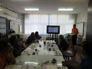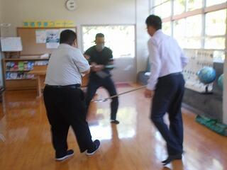 講話の後に、職員向けに研修をしていただきました。職員からのたくさんの質問にも答えていただき、刺股の使い方についても具体的に教えていただきました。