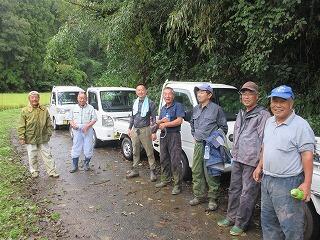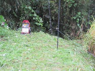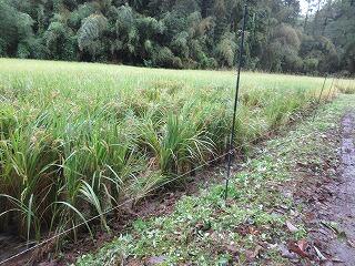 稲刈りが延期になりましたが、その田んぼに昨夜、イノシシが入った形跡があったようです。地域の方が田んぼの様子を見てくださっているおかげで、すぐにわかりました。このままでは、もち米を食べられてしまうということで、今日のお昼には地域の皆さんが集まって、電熱線で囲み、畦の草を刈るなどの対応してくださいました。