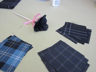 官公学生服グループでは、SDGsの取組として、制服の余り生地を使って、花をつくるという「エコフラワーを咲かせるプロジェクト」を行っています。本校も家庭科の森木先生の提案でその取組を始めました。