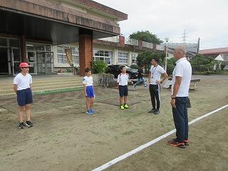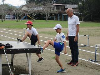 6年生が出場する都城市陸上教室に向けて、宮崎県立看護大学の串間敦郎先生に、陸上の指導に来ていただきました。大学の先生ということもあり、少し緊張感もありましたが、しっかり話を聞いて、一生懸命練習しました。特に、フォームを意識し、それを体得することができました。