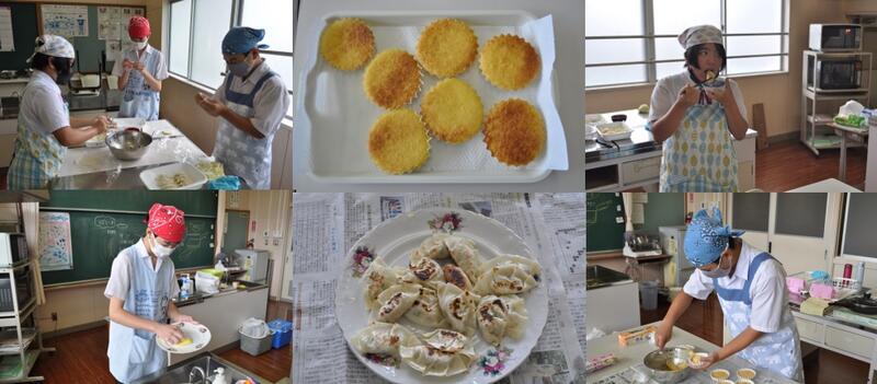 7月19日(火)、9年生(中学校3年生)が家庭科の時間に調理実習に取り組みました。この日作ったのは、マドレーヌ、餃子の2品でした。